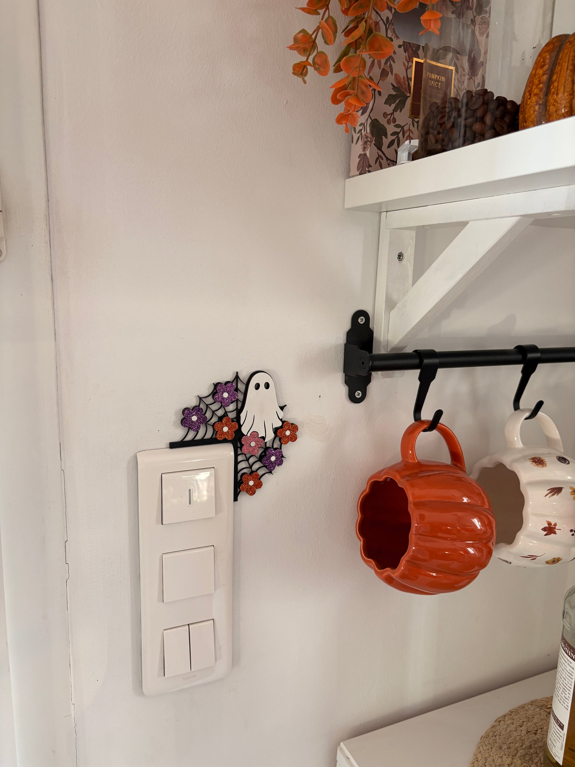 Nous adorons transformer chaque petit détail de la maison en moment magique ✨. Cette décoration d’Halloween est l’accessoire parfait pour vos prises et interrupteurs ! Un adorable petit fantôme blanc se cache dans une toile d’araignée décorée de jolies fleurs scintillantes aux couleurs festives 🌸🕸️.
